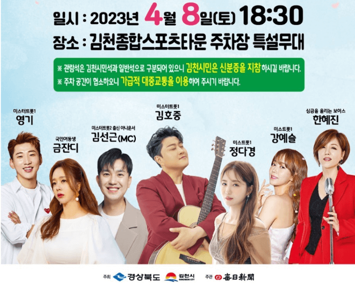 김호중이 출연한 이번 콘서트는 관람료가 무료인점과 김천 시민 우선 선착순 자리 배정은 김천 시민이라면 기분 좋은 공연을 볼 수 있었다고 생각합니다. 꽃샘추위로 추운 날씨임에도 가수를 향한 시민들, 전국에서 온 김호중의 팬 아리스까지 공연장은 열광의 도가니였습니다.